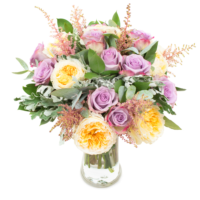 Devotion is a luxurious hand-tied bouquet from Florist Seven Sisters, designed to celebrate life's most meaningful moments. This elegant arrangement combines rich purple roses, sunshine-yellow garden roses and soft pink astilbe, uplifted by fresh eucalyptus, senecio and ruscus for a full, textured finish. Perfect as a romantic gesture, anniversary surprise or thoughtful birthday gift, Devotion adds vibrant colour and refined style to any room. Each bouquet is crafted with care by our expert florists in Seven Sisters, using premium stems selected for beauty and longevity. Flowers are delivered in bud to maximise vase life, so you can enjoy watching them open day by day, with up to The deluxe size bouquet offers an impressive, show-stopping display ideal for special occasions. Next day flower delivery is available across Seven Sisters and surrounding areas on orders placed before 4pm, making last-minute gifting simple and stress-free. Please note the vase pictured is for illustration only and is not included. Because some blooms are seasonal, we may substitute flowers of a similar colour, size and value to ensure your bouquet always looks fresh, full and beautiful. Choose Devotion when you want a premium bouquet that truly says it all.